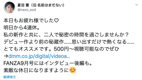 虽然用没有艺名的方式风光出道,虽然很快就决定了「夏目响」这个名字,不过很奇怪,发完第2支作品后,这位SOD精心培养的超级新人就没有作品了⋯